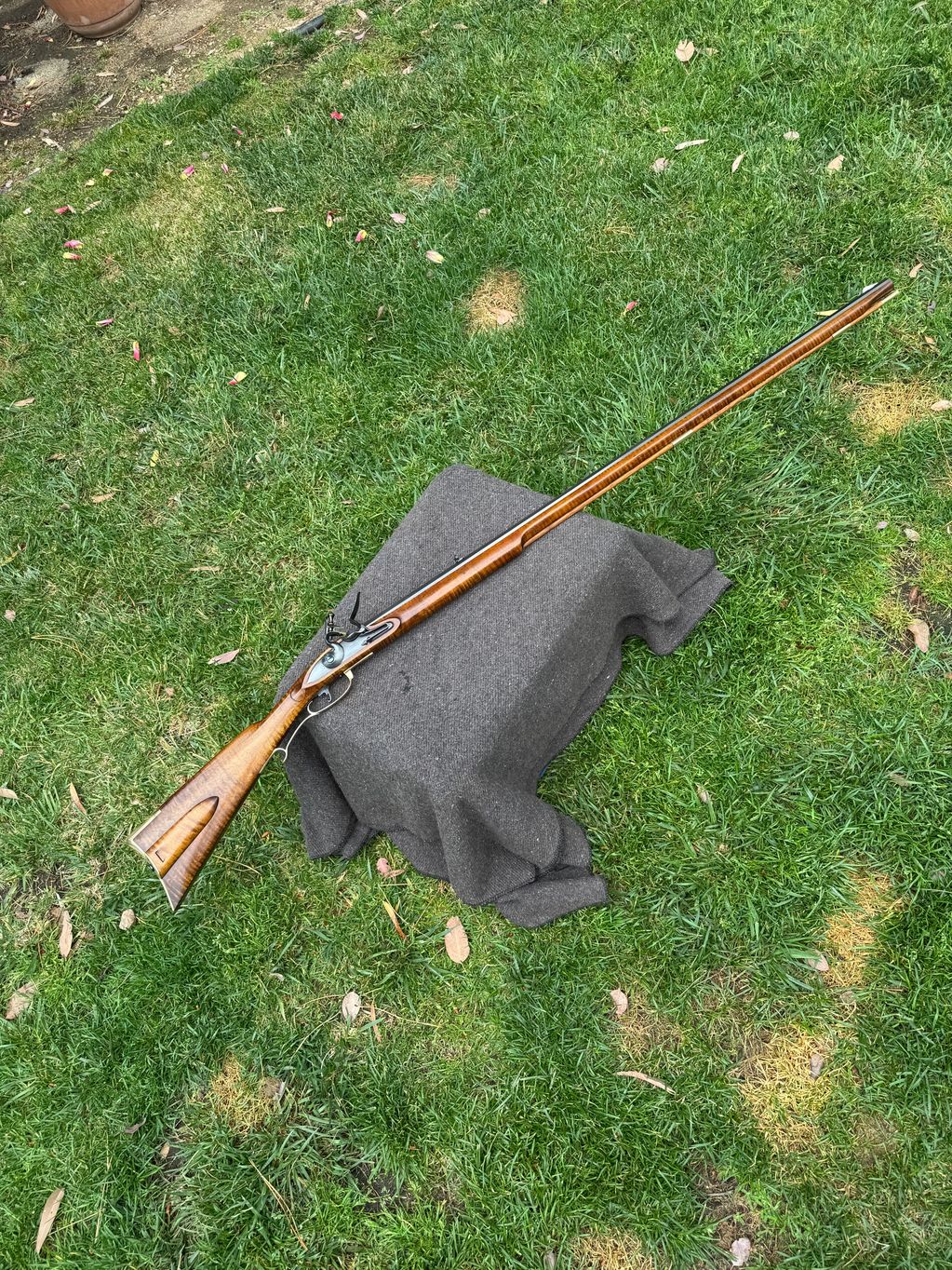 Rifle shown with optional percussion cap lock, upgraded curly maple stock, Nose cap, toe plate, entry pipe, double triggers, sling swivels, browned barrel and lock, and brass attachments